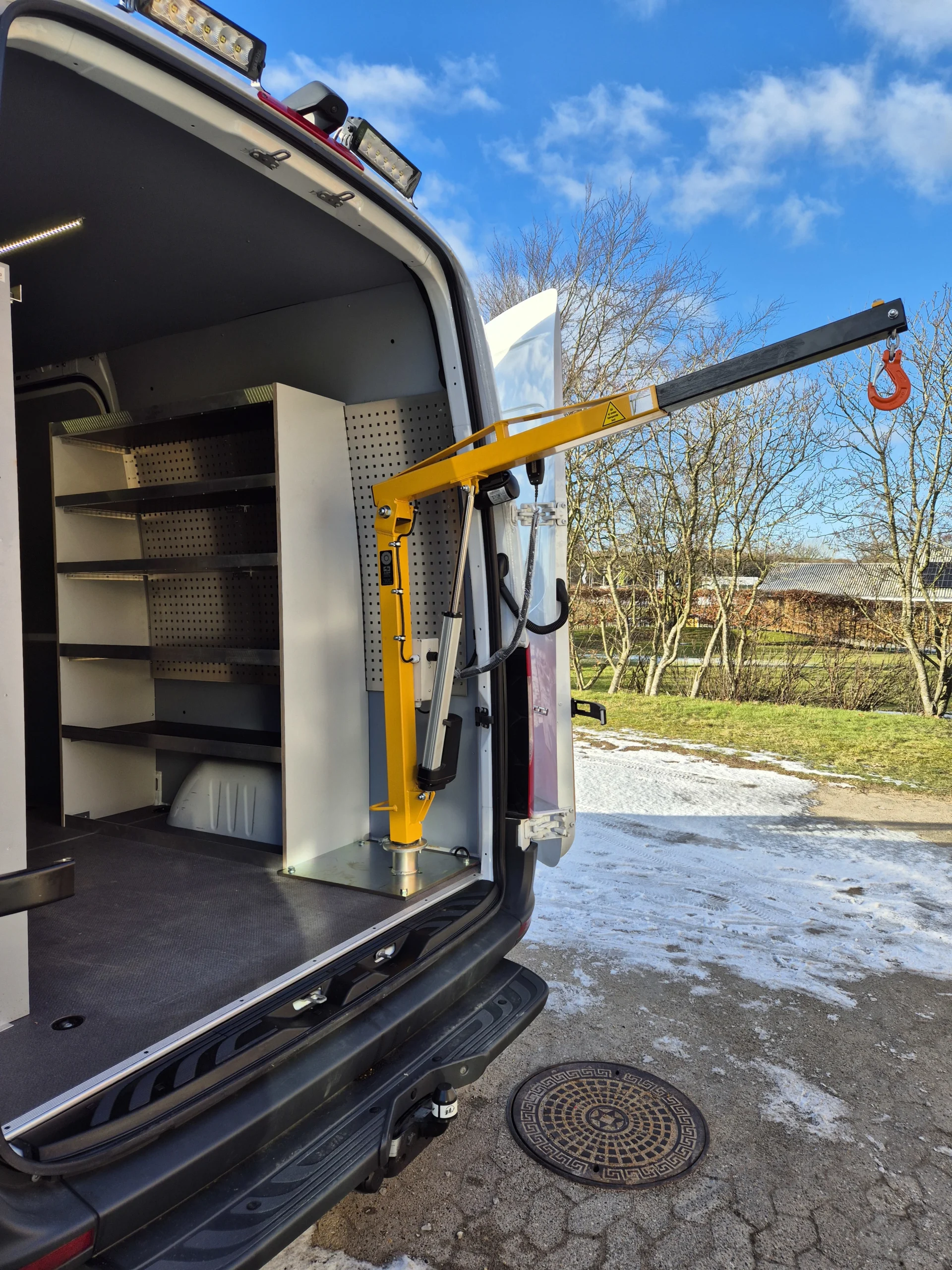 Vi ved, at forskellige fag har forskellige krav til håndtering af tungt udstyr. Derfor tilbyder vi rådgivning og montering, så kranen bliver en integreret del af bilens indretning. Den elektriske løftefunktion og det elektriske udskud mindsker belastningen på medarbejderen, og kæden giver fleksibilitet til løft af specialudstyr. Resultatet er en løsning, der øger både sikkerhed og effektivitet – uanset om du løfter maskiner, materialer eller værktøj.